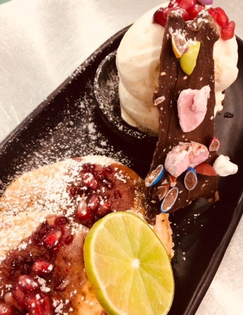 Vanilla Bean Pancakes, icecream, lolly bar with choice of sauces: