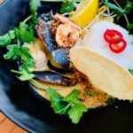 Asian herbs, rice noodle, peanuts, fried shallot, nuoc cham