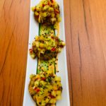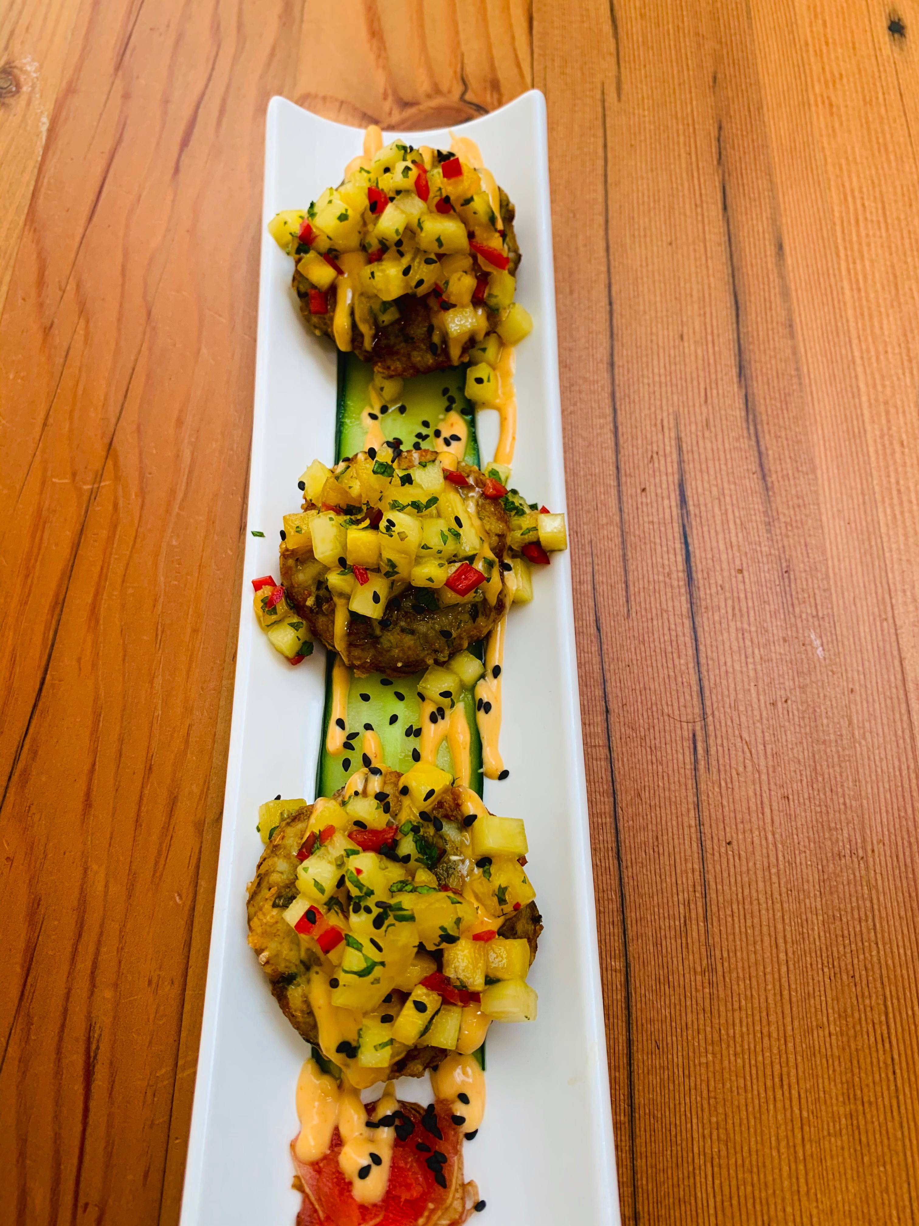 Barramundi, lemongrass fish cakes, pineapple salsa, sriracha aioli